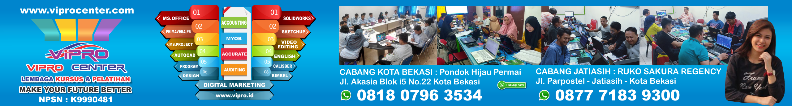 Lembaga Kursus dan Pelatihan VIPRO CENTER membuka Program Kursus Komputer MS Office, Kursus AUTOCAD, kursus solidworks, privat primavera p6, pelatihan MS Project